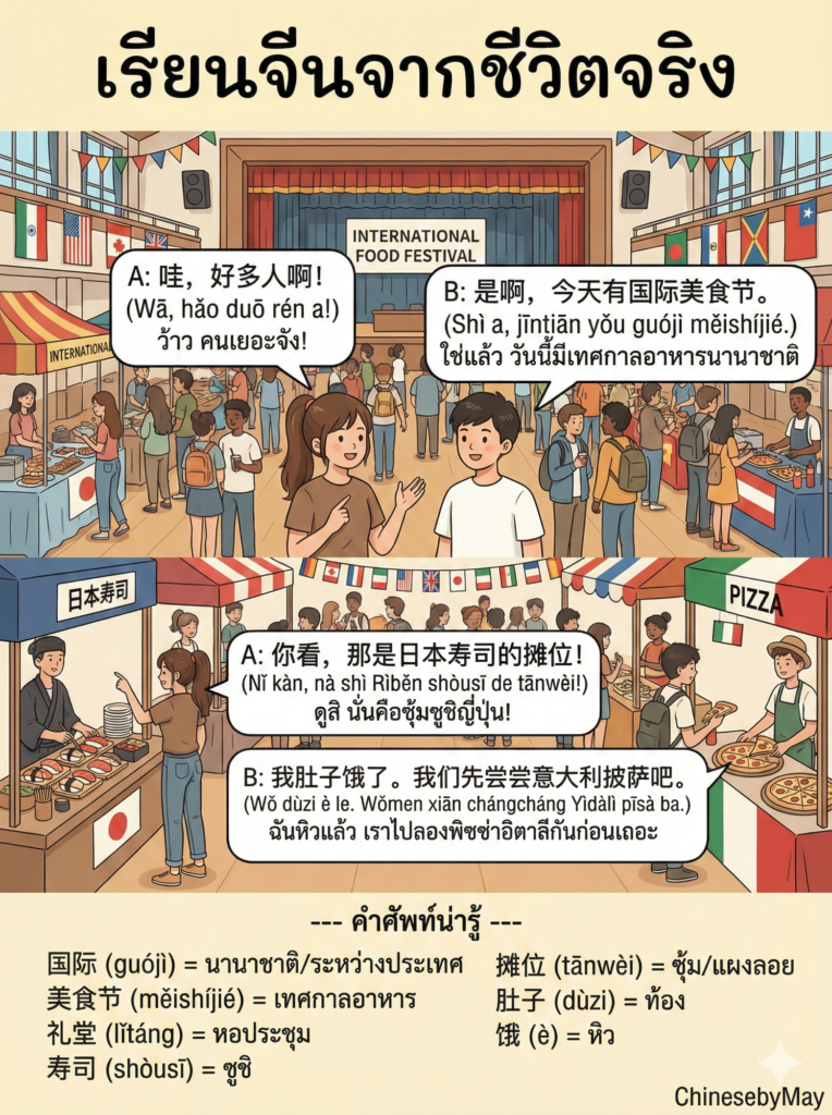 เดินเที่ยวเทศกาลอาหารนานาชาติBy May Laoshi / 3 กุมภาพันธ์ 2026 ถิงถิงและเพื่อนเดินเที่ยวเทศกาลอาหารนานาชาติ ชวนทุกคนเรียนรู้คำศัพท์กันค่ะ